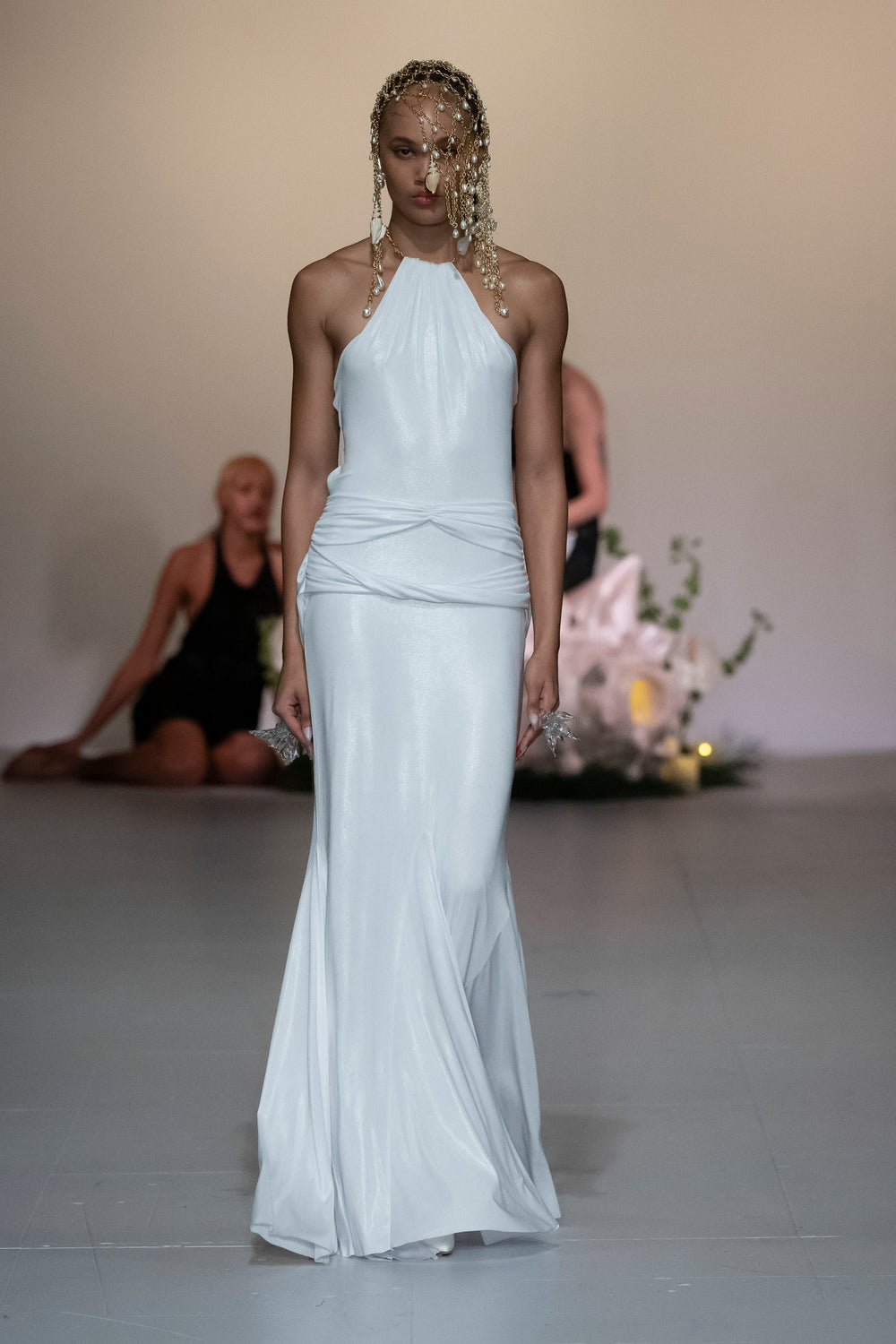 The Gold Pearl and Shells Chainmail Headdress is hand crafted, blending gold chains with statement faux shells decoration, that cascades at the front framing the face, adorned all over with Pearl accents across the asymmetrical design, enchanting a mythological goddess.
