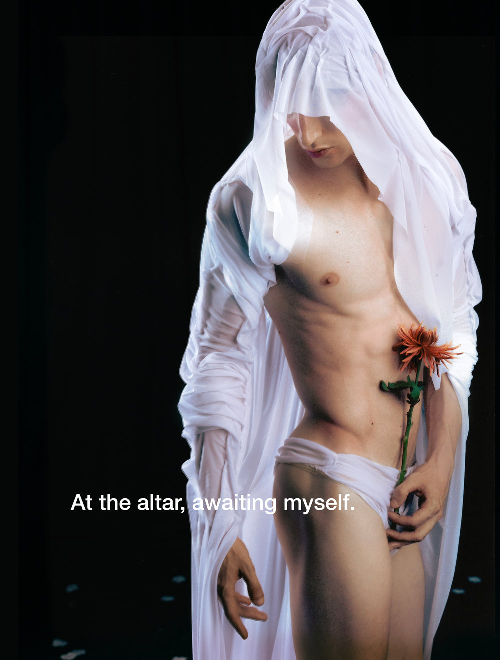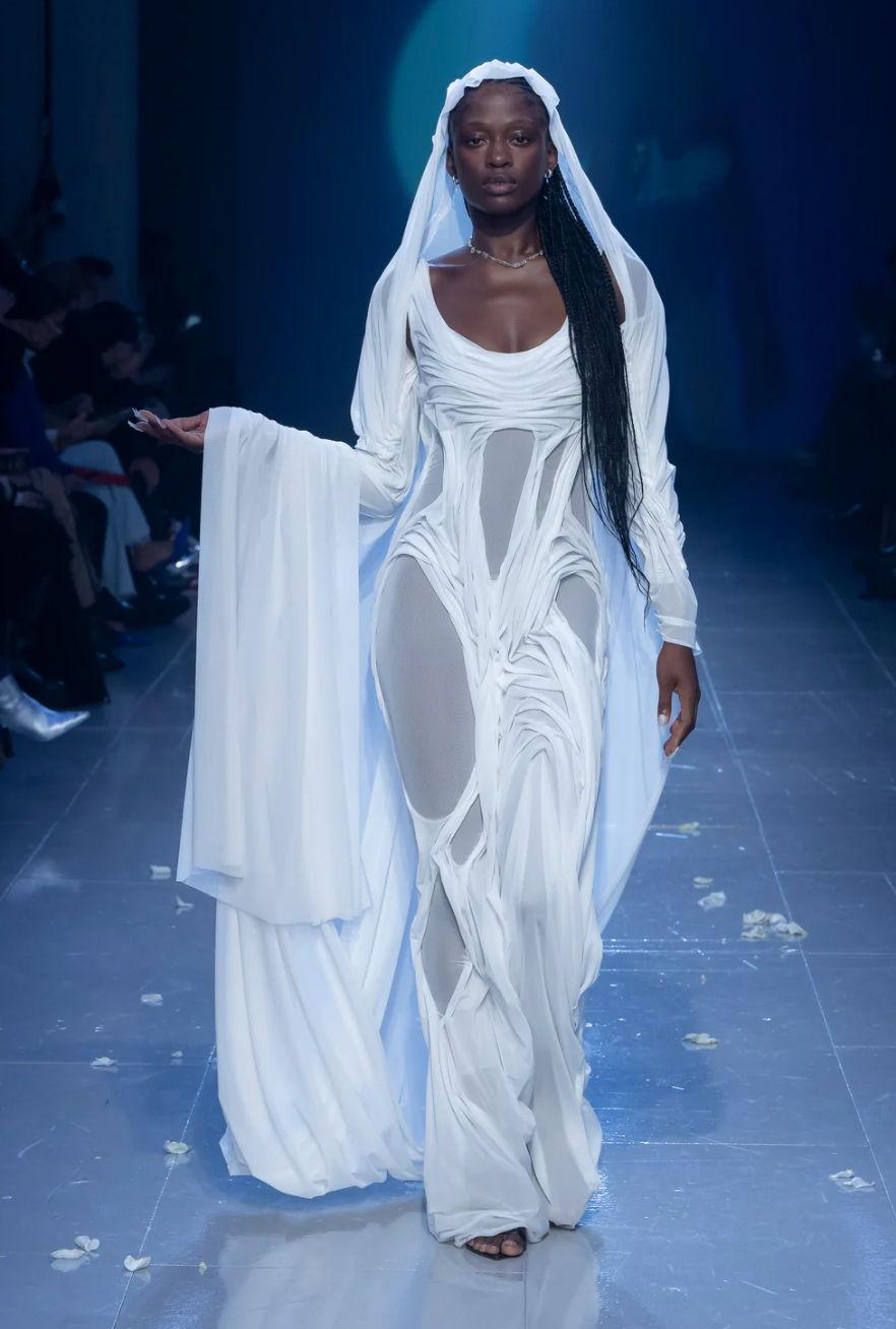 The Wetlook Veil is a couture hand-crafted piece, intricately draped and sewn to create the ethereal illusion of water rippling across the body.