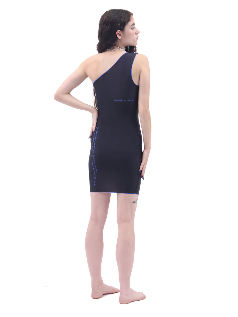 Goddess Aphrodite one-shoulder stretch lycra dress, with poetic Wetness scripture print. This dress works great to be worn as an undergarment to our mesh dresses and tops for added coverage.