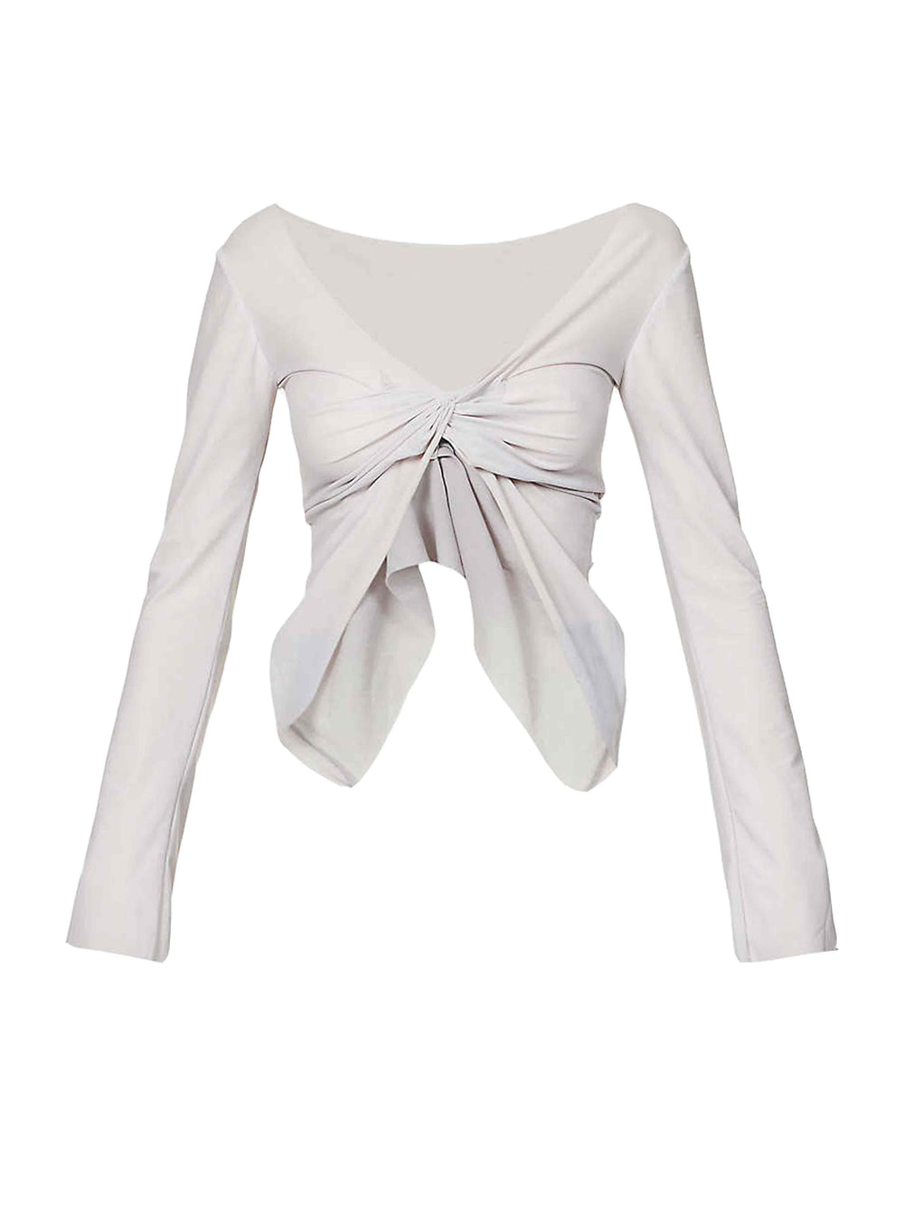 Light Grey, long sleeve twisted front cropped blouse, with pin tucked pleat detailing at the back.