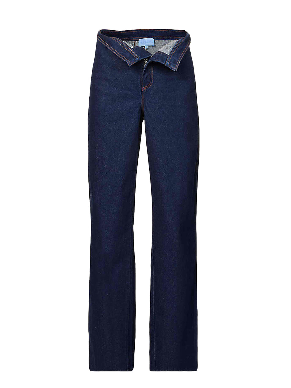 Blue organic cotton denim jeans, with undressing button to be styled open