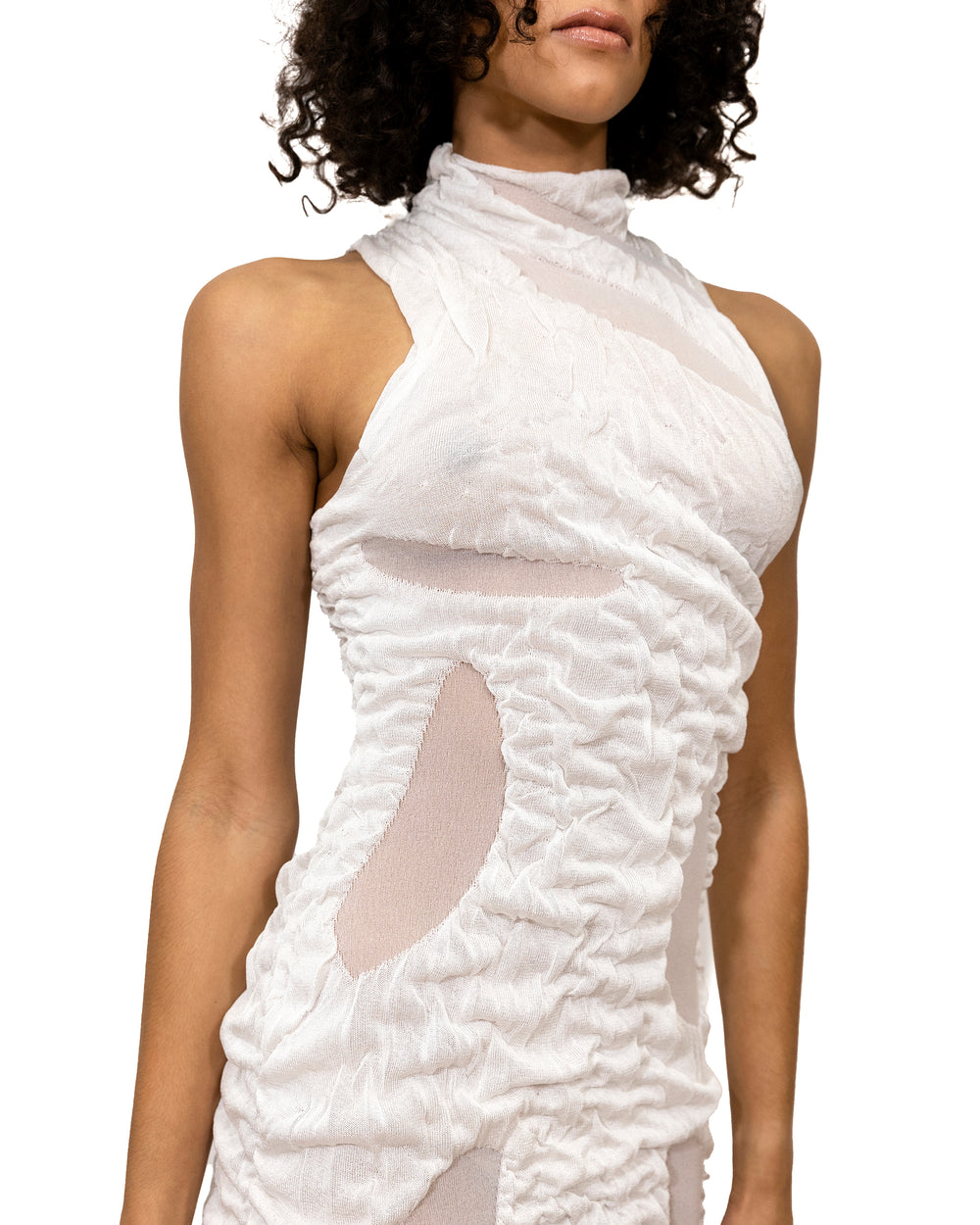 High neck sleeve-less knitted mini dress in Wetlook technique design, with semi-sheer panels contouring the body.