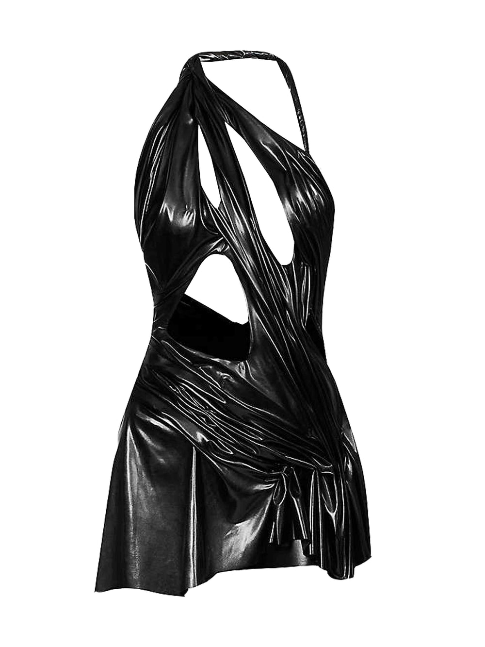 With a twisted halter-neck, this draped mini dress features cut out detailing across the body and an asymmetric hemline.  Made from a stretch woven fabric, that has a luxe high shine "leather effect" finish.