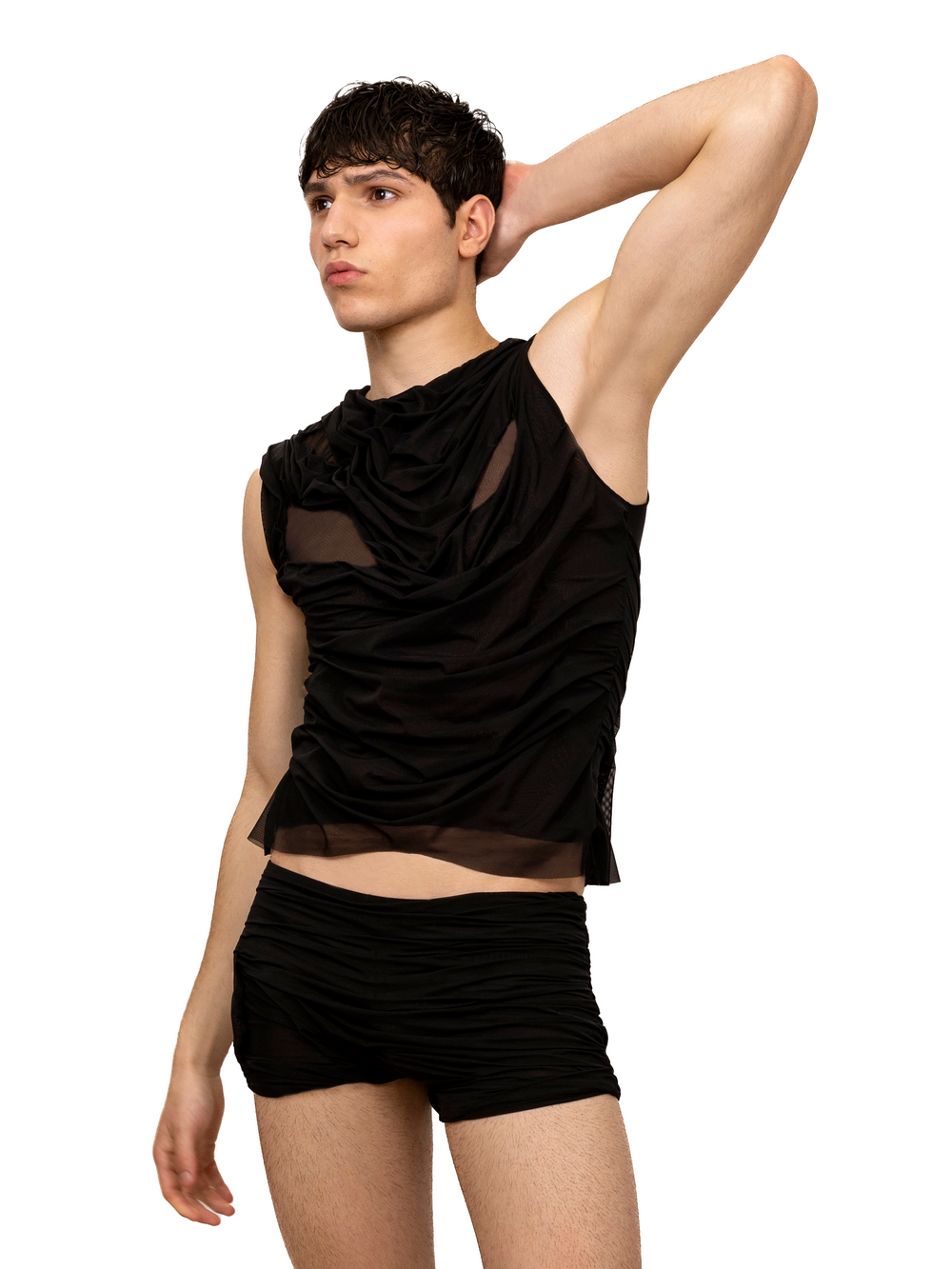 The Wetlook Tank Top is a couture hand-crafted piece, fluidly draped and sewn in the "Wetlook" technique, with sheer panels that give the illusion of the fabric being wet and clinging to the body.