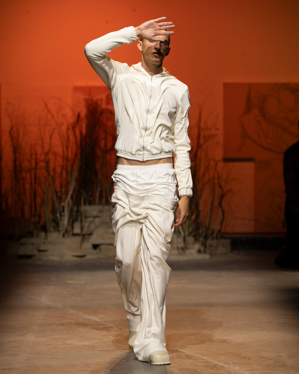 The Wetlook Tracksuit Bottoms is a Unisex design, that is hand hand draped to emulate the fluid ripples of water across the body. The bottoms have a relaxed fit and double waistband, to give the illusion of the low-hanging trousers.