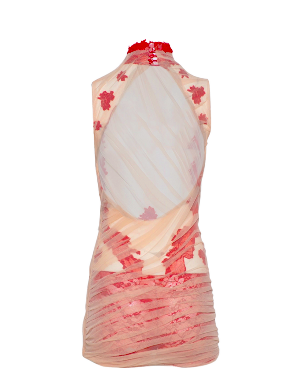 The Lace Desire Mini Dress is expertly hand draped and crafted with a double layer of nude mesh fabric, that is draped above the red lace that is cut to mimic the appearance of underwear under the dress, that accentuate the body's natural curves. Its backless design is complemented by a high neckline with lace detailing.
