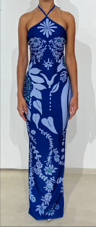 The dress features a halterneck strap neckline, and a graphic all over floral print design that inspires purity and femininity.