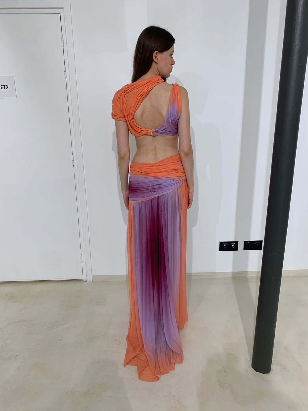 The dress is made from a mesh material, and so the fit is very stretchy and adapts to the natural curvature of the body. The Sunset Gradient colour way is reminiscent of a serene summer sunset.