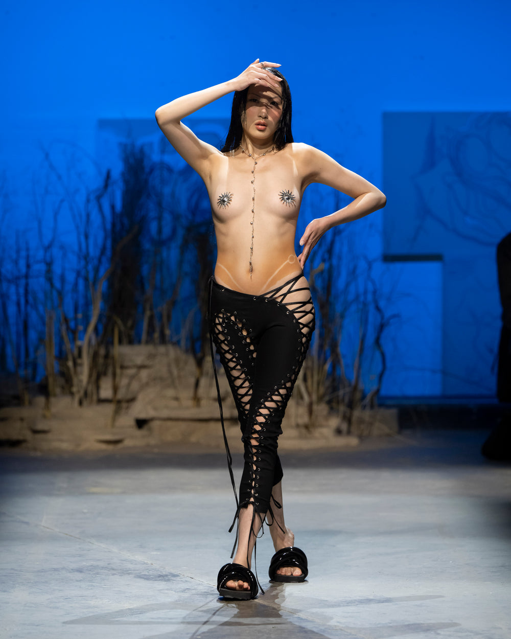 The Siren Capri Pants are cropped at midi length, and feature organic body contour cutouts along the leg that lace up and tie at the waist in cross cross style. The jeans have a side zip opening.