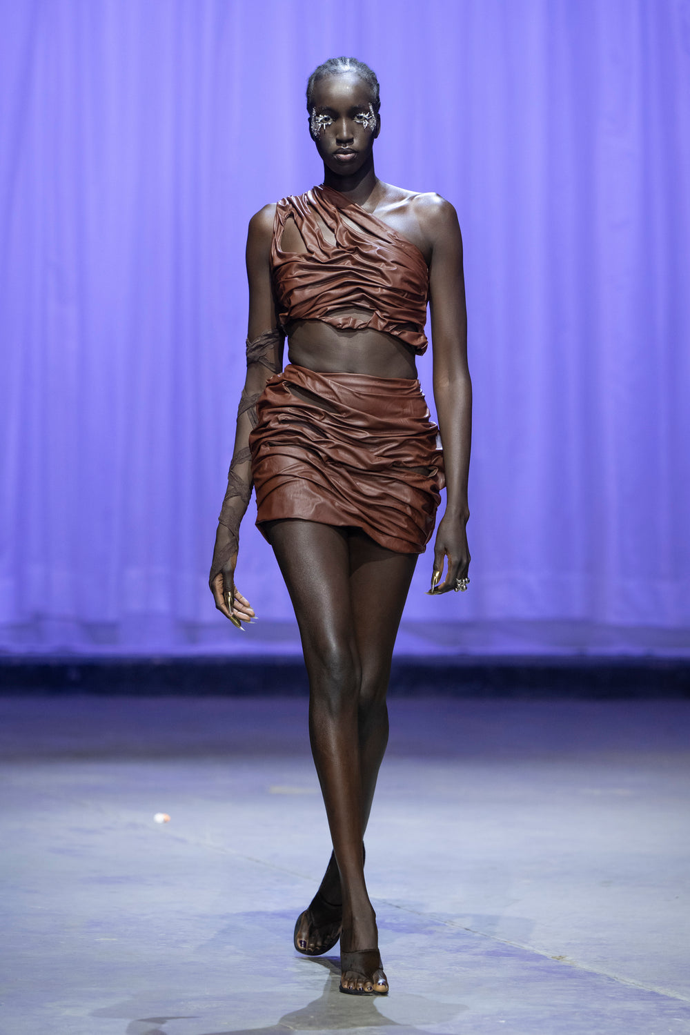 The Eros Mini Skirt is hand draped in faux leather, to emulate ripples of water across the form, in the iconic "Wetlook" style. The skirt features cut out details at the side of the hip.