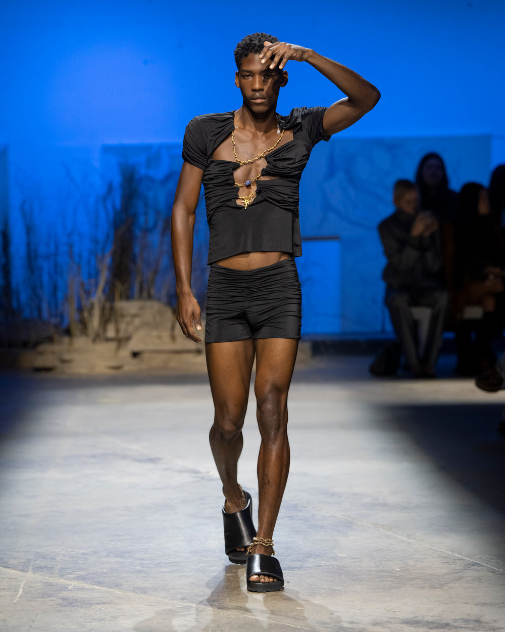 The Ruched Temptress Sleeve Top is a Unisex piece, made with ruched drapery detail across the chest. The Top features two cap sleeves, and a cut out neckline that is decorated with intricate hand-carved gold plated jewellery, including a trident pendant along with a healing crystal, elevating it to a mythical level.