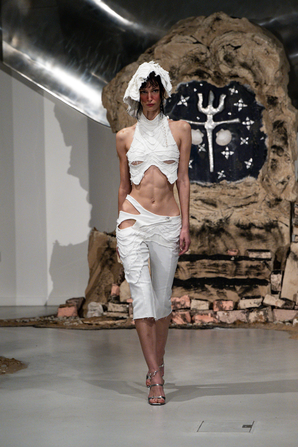The Sea Ripple Denim Capris are crafted from 100% white cotton and feature a distressed pattern inspired by the gentle ripples waves create on sunlit sand during summer. Designed with two hip cutouts, these capris accentuate the body's natural contours.