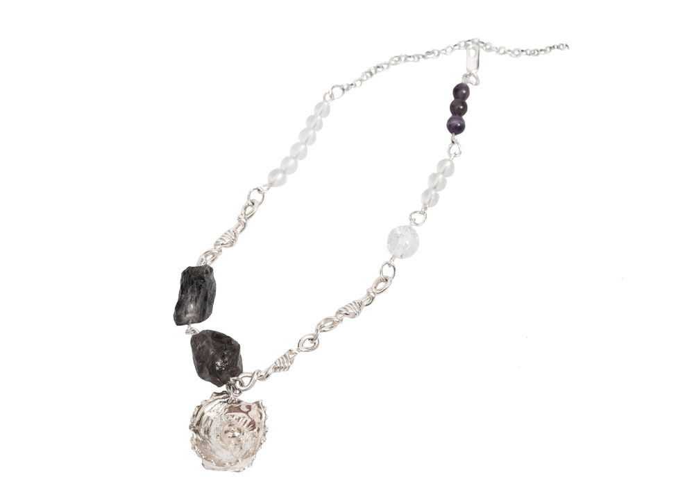 Hand carved statement shell sterling silver necklace, adorned with healing Quartz, Smokey Quartz, Amethyst and glass beads, inspired by ancient Greek protection jewellery.