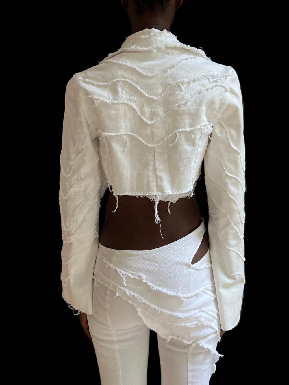The Sea Ripple Denim Jacket is crafted from 100% white cotton and feature a distressed pattern inspired by the gentle ripples waves create on sunlit sand during summer. This piece features a collared, cropped design.